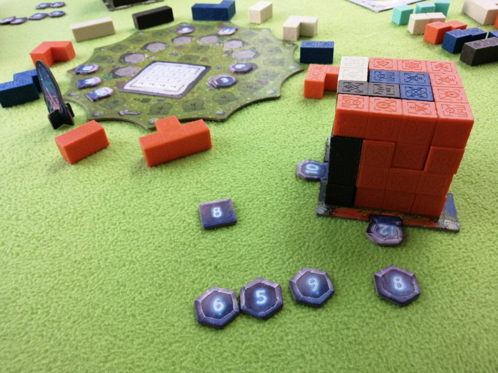 個人ボードの4辺には色があり、その色のブロックを必ず配置しくてもよいですが予言に関係します。予言のアクションは7〜16のタイルから1枚を選びボードのくぼみにはめ込みます。
