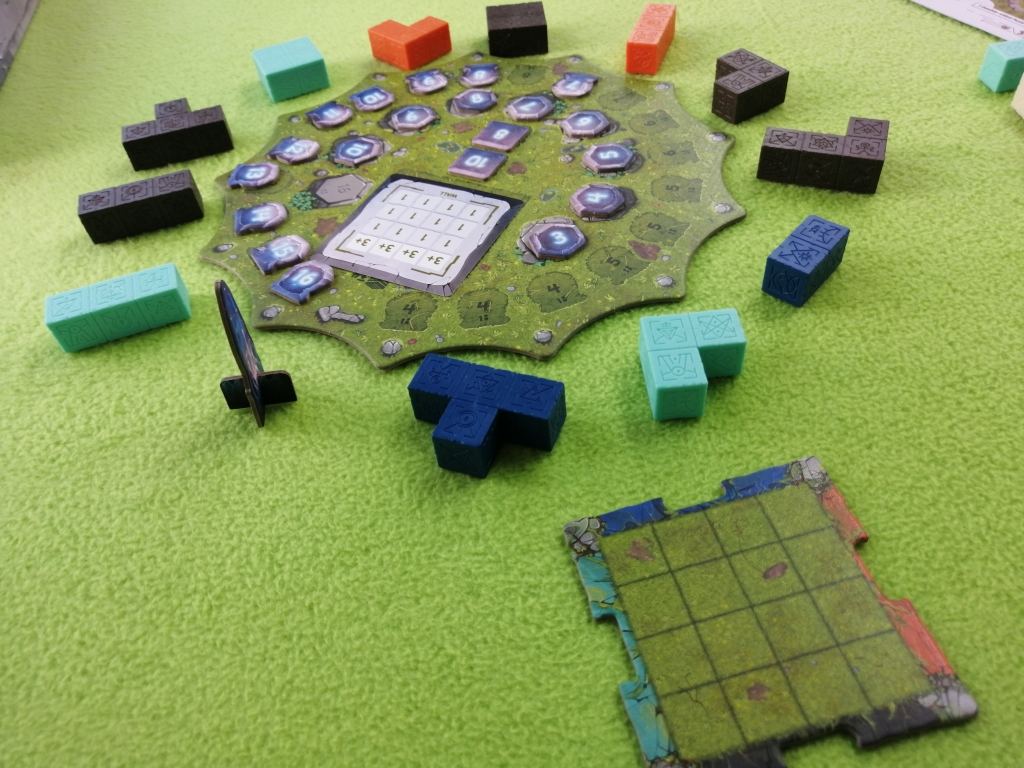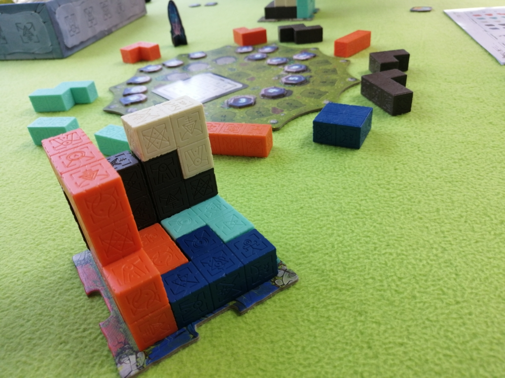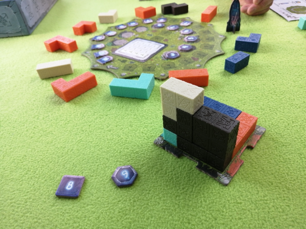 5色のブロックがあり、手番では1〜4個先にあるブロックを1個選び個人ボードに配置するか予言をするかをします。