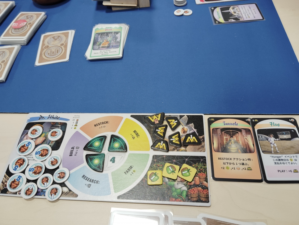 山札から働けるカードが公開されない限りはアクションができないので「早く働かせて下さい。まだやれます。」と、実際の職場では言わないようなことも言いますけど、山札には4枚しか入っていないので、なかなか公開されず人口は減るばかりです。