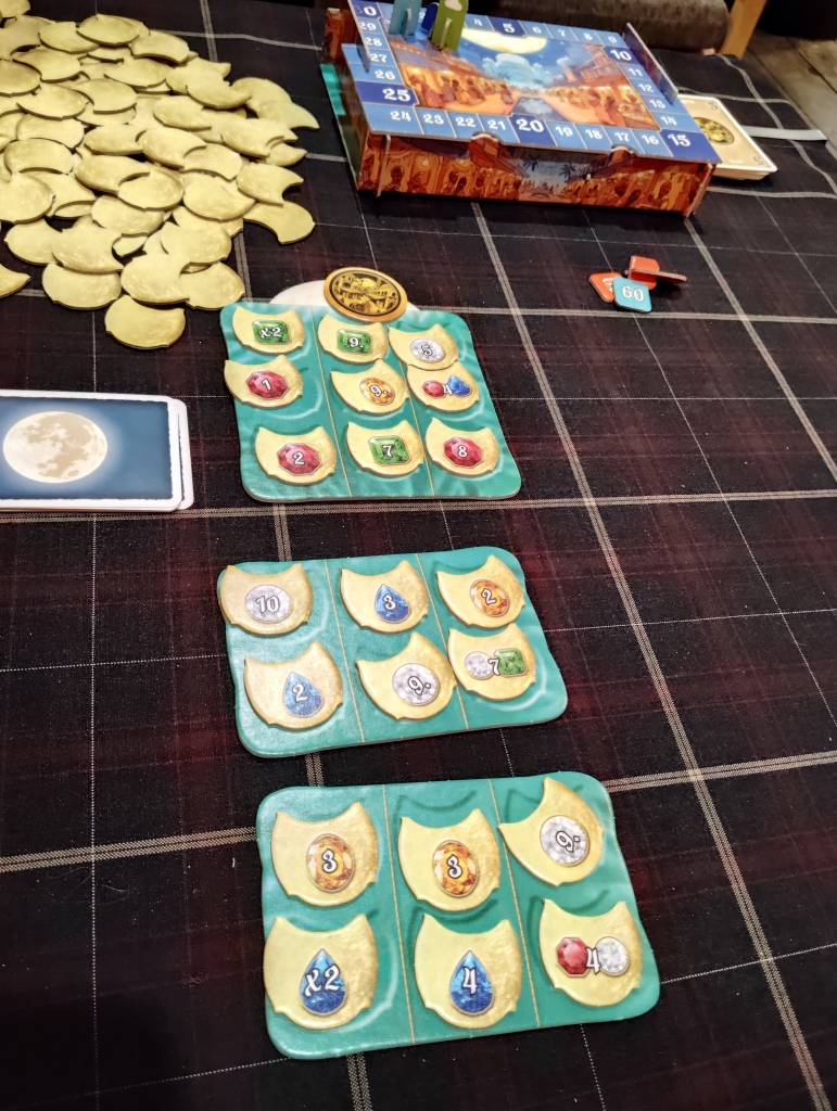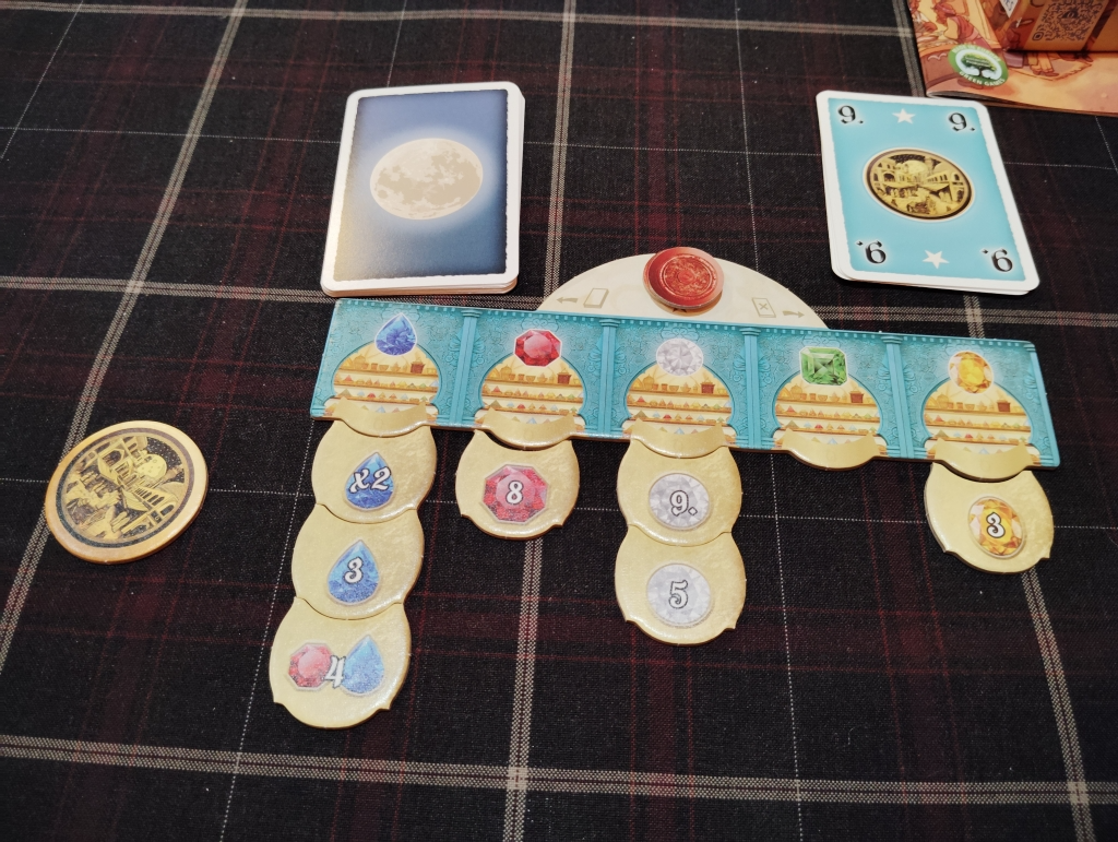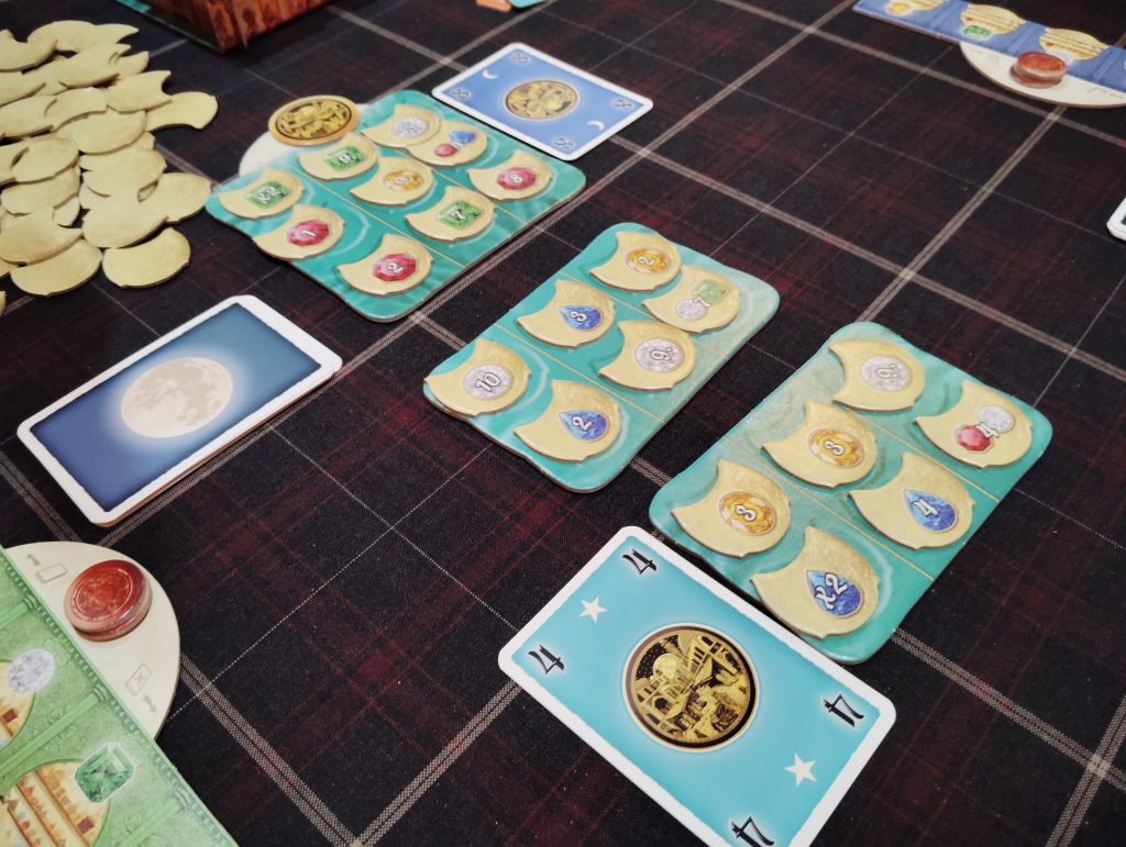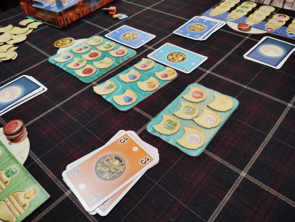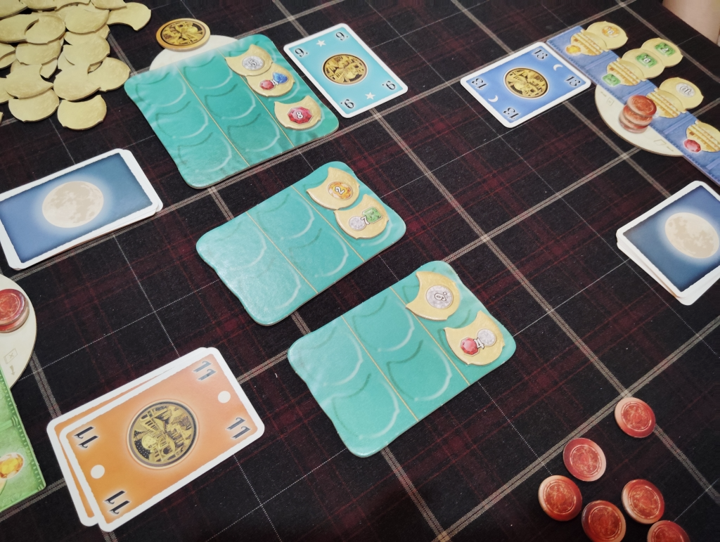 手元にある各色の宝石は3、6、9ラウンド終了時に各色ごとに数字合計を比べ合い順位に応じた得点を獲得できます。