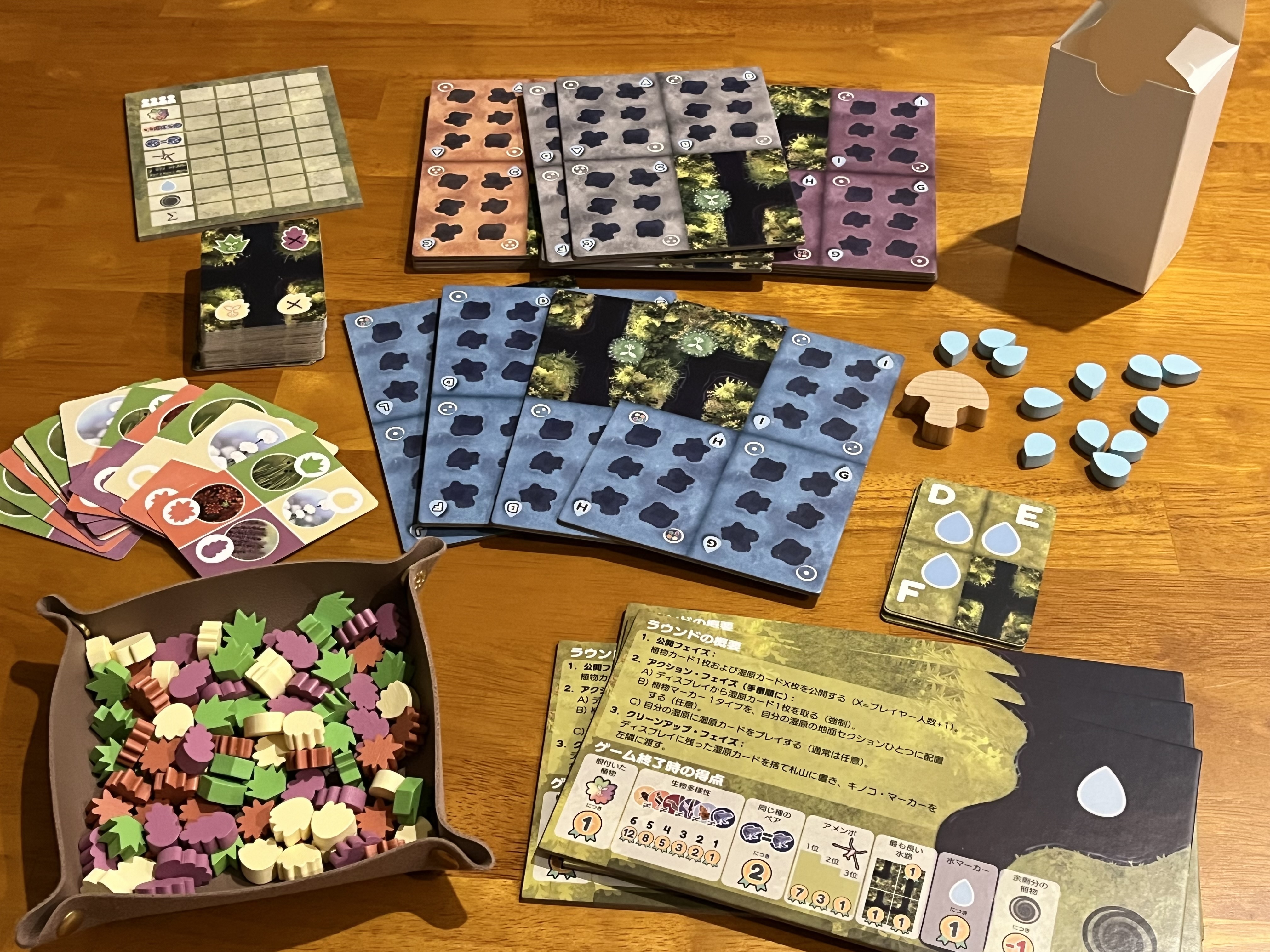 コンポーネントは大量の細かいユニークな形状のタネコマ、カード類はアートワークと視認性を両立させ、こだわりを感じる素晴らしいものです。