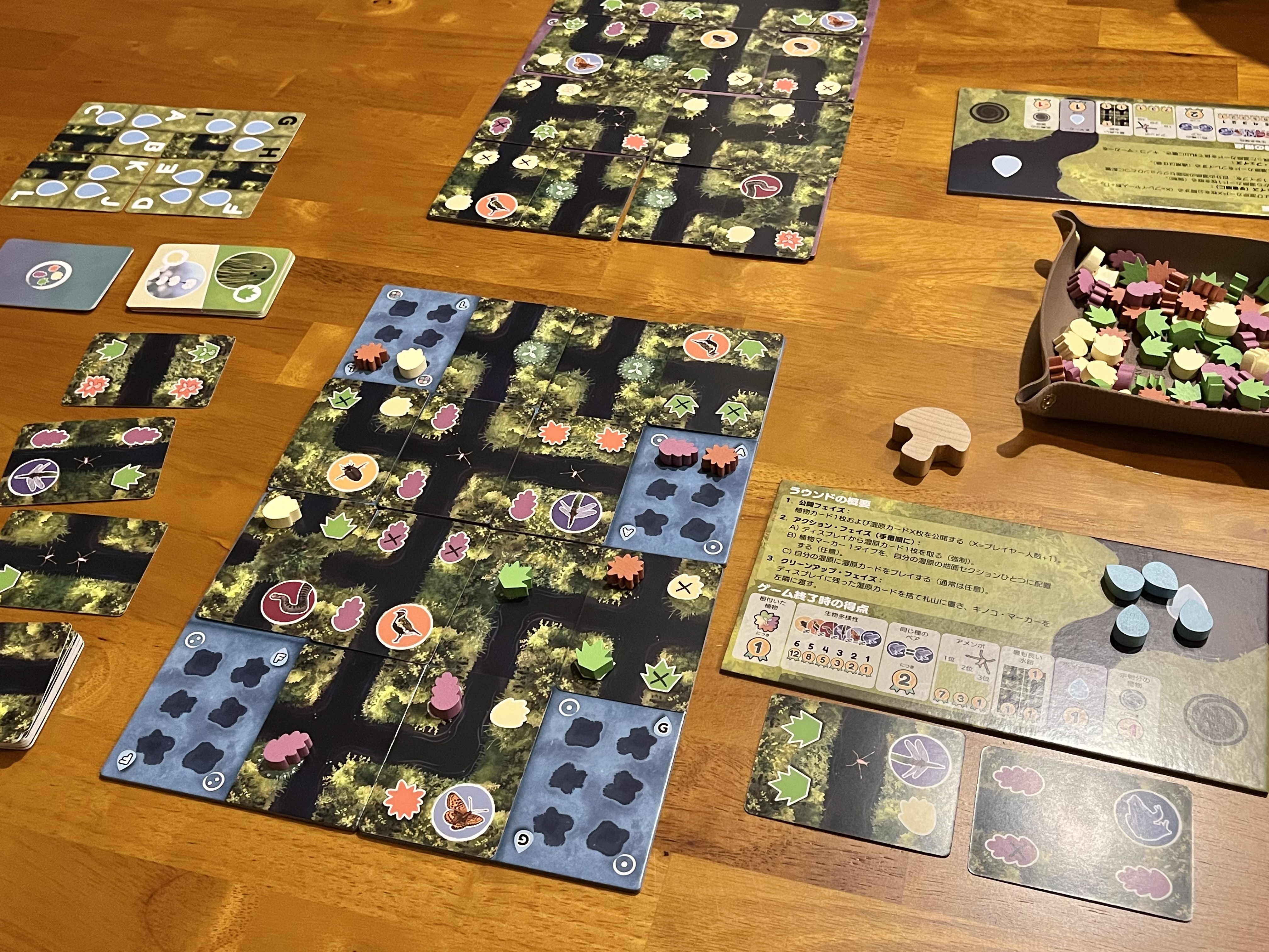 全員が同じ配置になるよう組まれた生態系ボードの上に、水路カードをプレイしていくことでゲームは進行します。