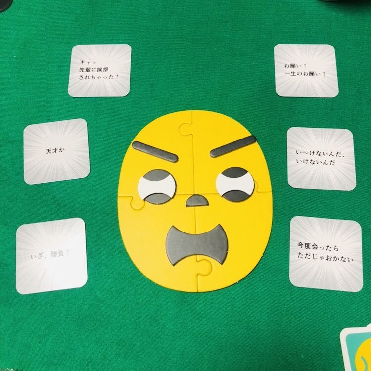 顔を作るプレイヤーが一人、お題カードの山札から1枚引いて、