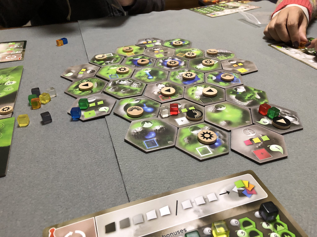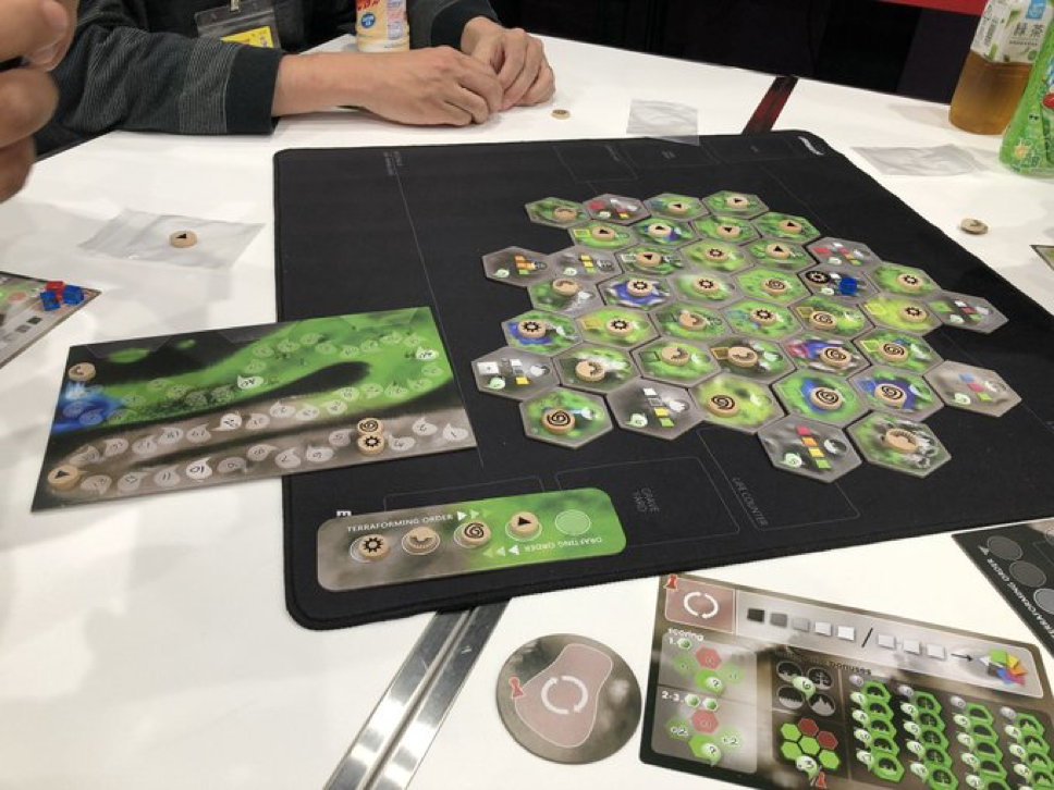 そのようなテーマに意味を持たせるかのように、テラフォーミングしたヘックスタイルに隣接したタイルの所有者は勝利点を得られるという連鎖ボーナスがあり、タイル配置にも多くの考えどころがあるように作られていて面白い。