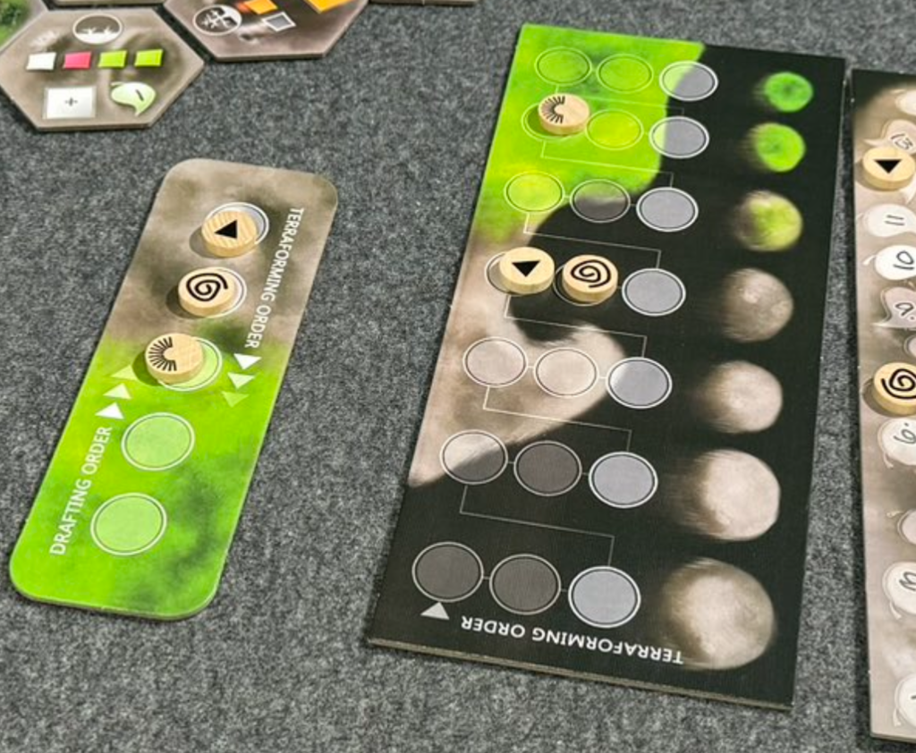 ドラフトでは得られた限られた数のリソースしか持てないため、ゲーム序盤は1ラウンド中複数回のテラフォーミングがなかなか難しい。事実上、行動範囲に制限が大きく課せられているのに等しいのだ。