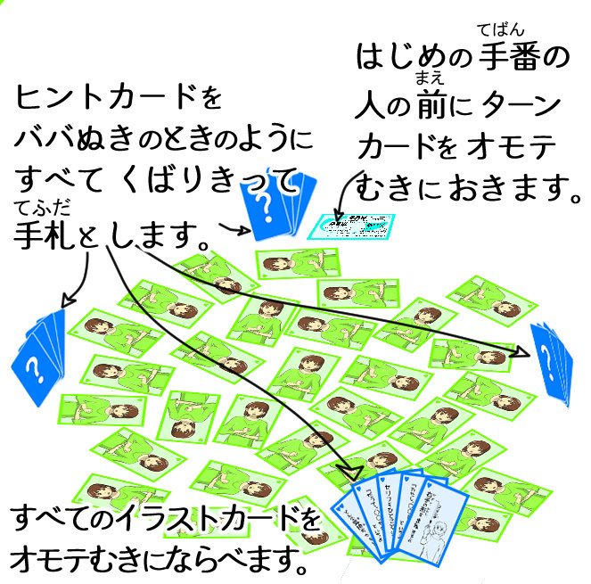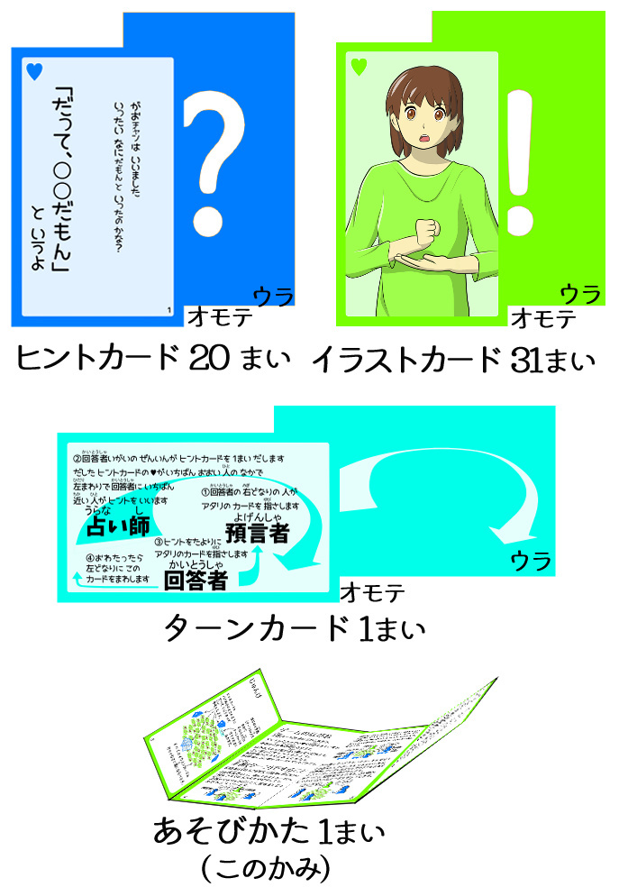 手番(ターン)を左にまわしながら、 ゲットしたカードの♥の合計をきそいます。 手番の人が回答者になります。 ほかの人から1名が占い師にえらばれます。 占い師のだすヒントをたよりに、回答者が アタリをあてられたら、回答者と占い師が カードをゲットできます。