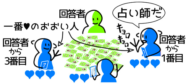 回答者いがいの全員が、手札から1枚をえらび、 自分の前にウラむきにおきます。そのカードの ♥のかずをゆびでいっせいにしめします。 一番おおい♥のかずをしめした人のなかで、 左まわりで回答者に一番ちかい人が占い師に なります。