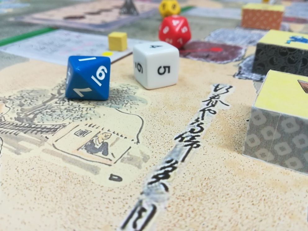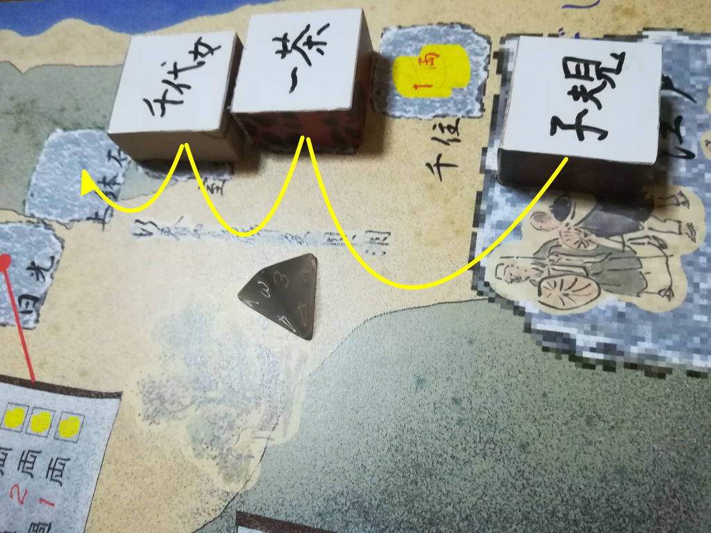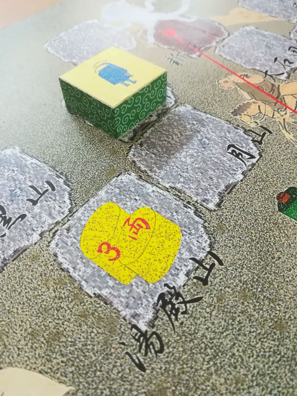自分の番になったら、サイコロ(ダイス)を振り、出目で移動先に進みますが、サイコロを振る前に、移動手段を選ばなくてはなりません。徒歩はタダで行けますが、おんぶは2両、大八車は3両、かごは5両、早馬は9両といった具合です。