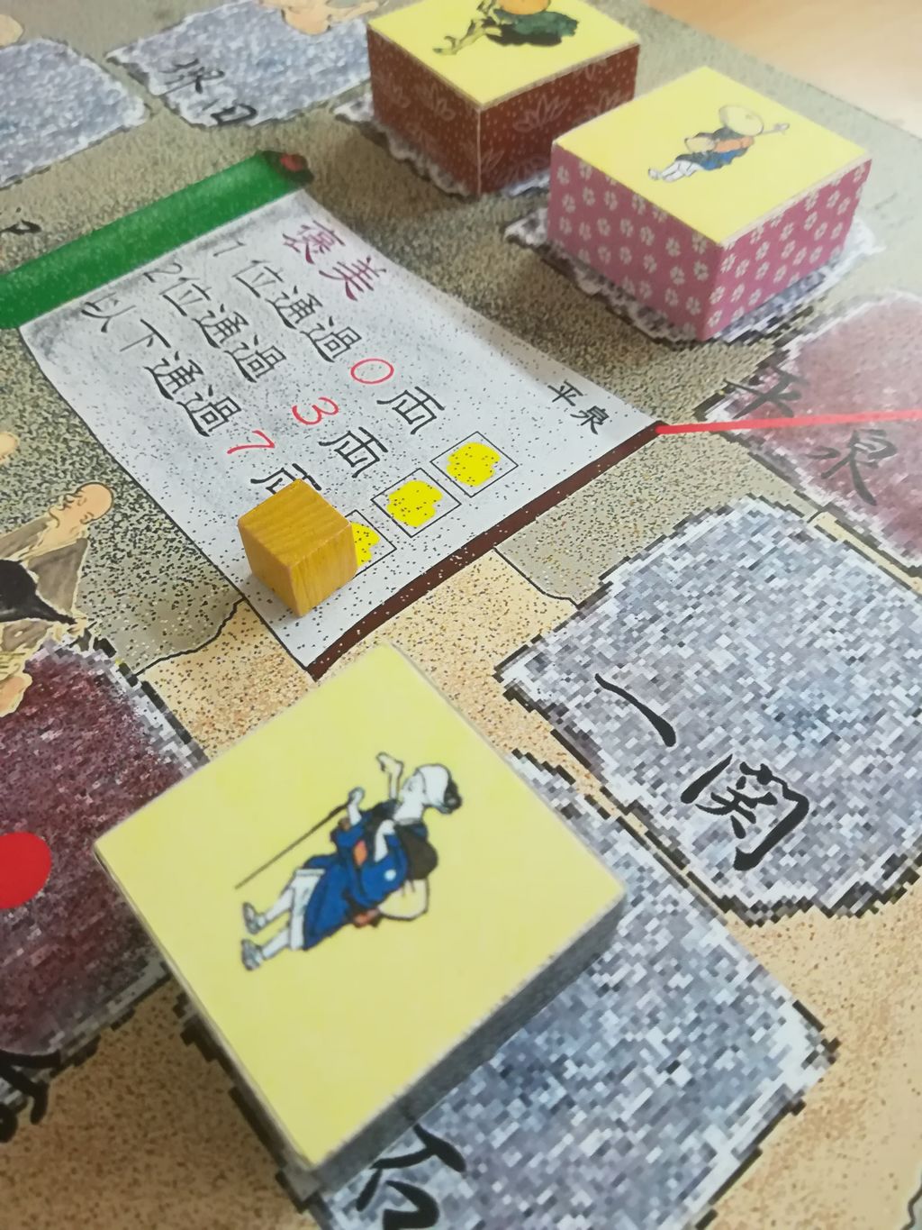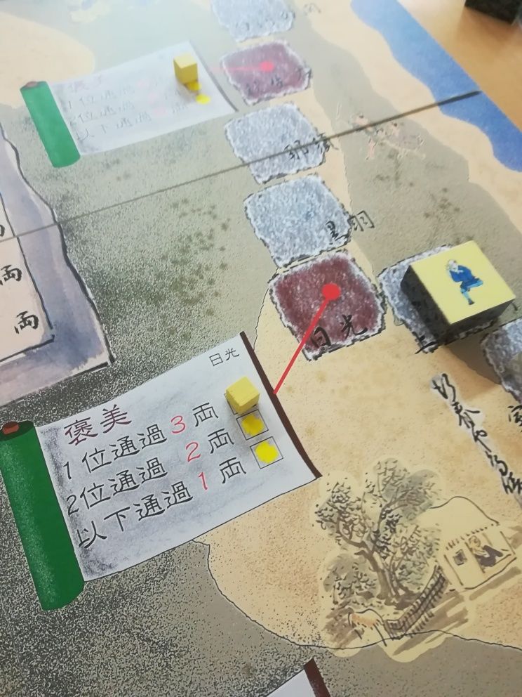 また各名跡のマスを通過、もしくは止まった場合、その通過した順位によって、お金を受け取ります。各7つの名跡地で受け取れるお金は、それぞれ異なっていて、「日光」などは早く着けば、人より多くお金をもらえますが、「平泉」のように、人より遅く巡った方が、多くお金をもらえるポイントもあります。