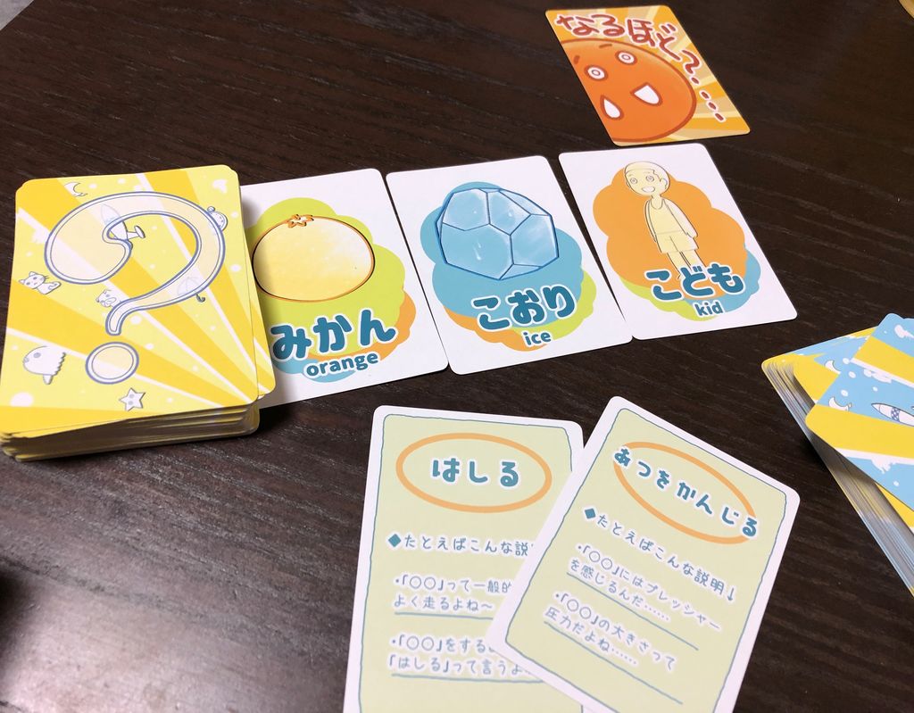ちなみに、氷とかみかんとかの単語は、説明する言葉(走る、とか)を決めたあと、1つ増えます!なので説明が得意な人で自信のある人も、たじたじになる可能性もあり。