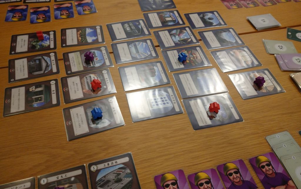 ゲームのコンポーネントに関して、ワーカーがカードなので、配置する際に取り扱いにくい感じがあったので、代わりにミープルを使用してみたらいい感じになりました。