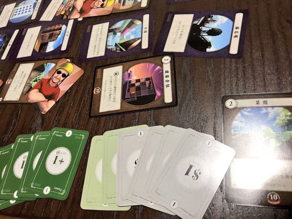って感じで全然まわすことができず、というかカードを全然引けず、菜園はなんとか死守できてお金がちょっと余って菜園の勝利点トークンがあって。