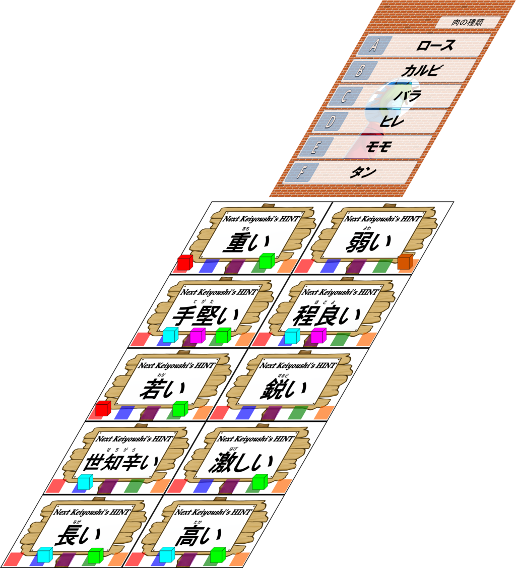 プレイヤーは赤、青、紫、緑、茶のキューブのどれか1色を10個ずつ持っていますので、自分の担当する肉の種類が「重い」と思ったら持っているキューブを形容詞カードに置いて下さい。