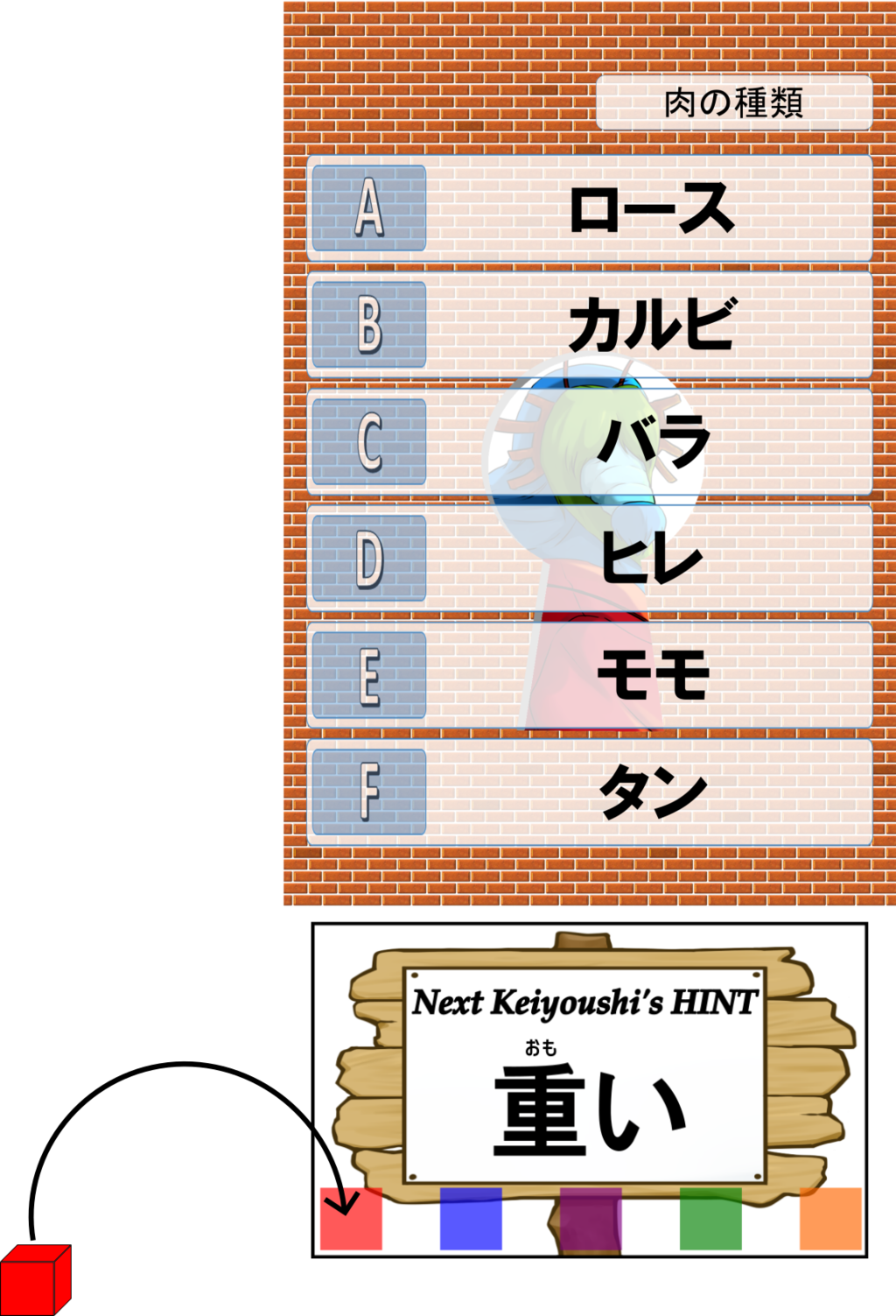 このカードがお題だった場合、Aの正解カードを持っているプレイヤーは「ロース」、Bの正解カードを持っているプレイヤーは「カルビ」が自分の担当となります。
