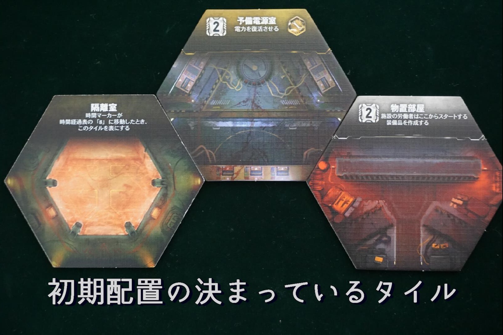 - ボードの指定された位置に「 メインゲート、ローバー、エレベーター、電力、貨物配送時マーカー 」それぞれのトークンを配置します。電力トークンはランダムに配置し、現在の施設への電力供給状態を示すために1と2のトークンを送電中表示にします。