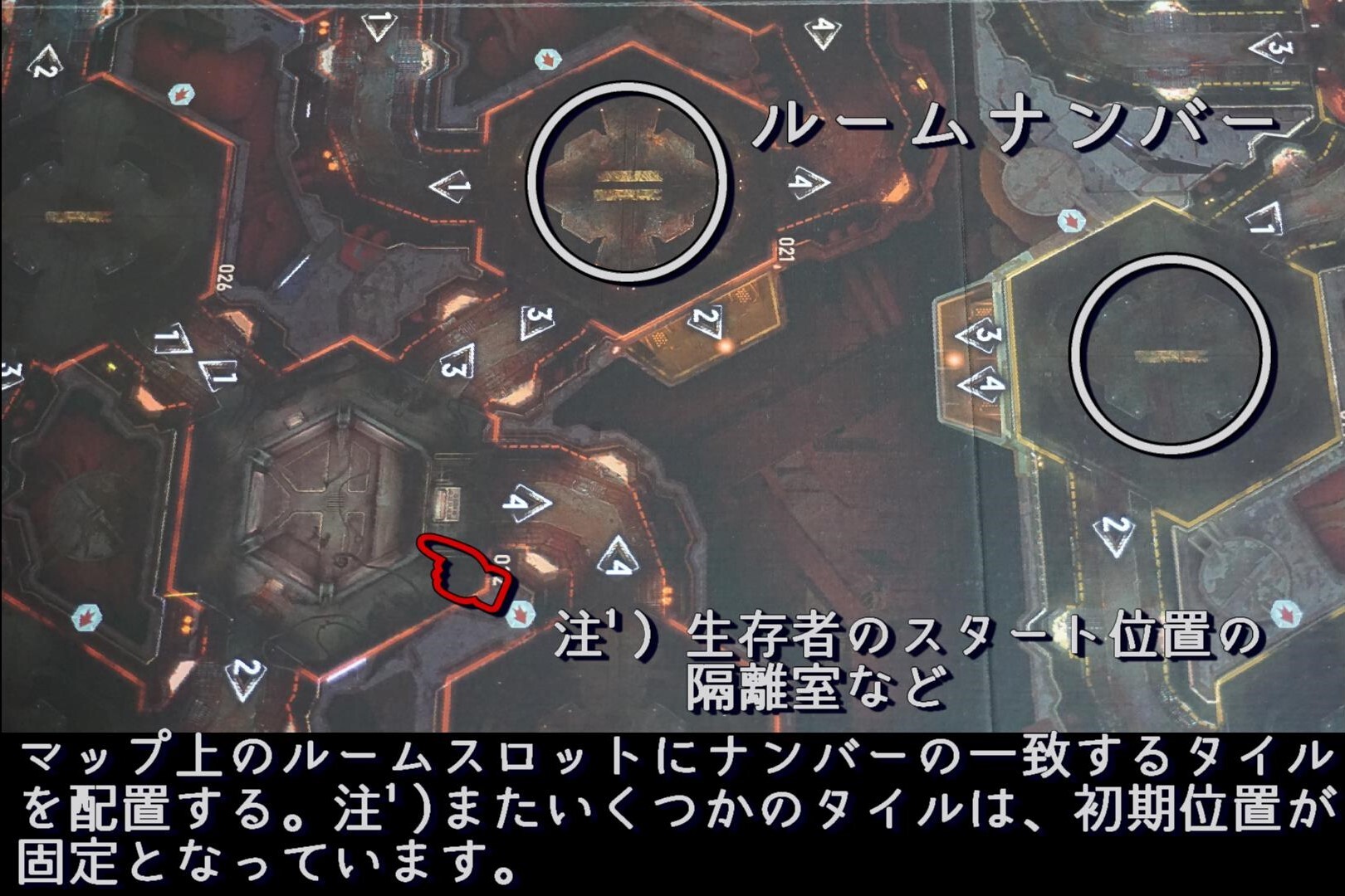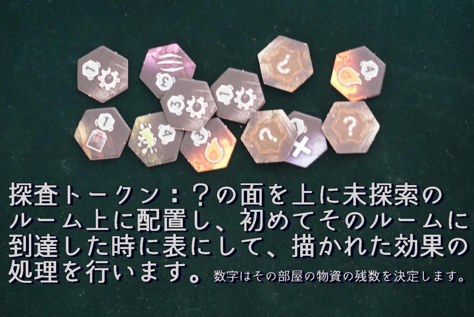- ルームタイルをボード上にランダムに配置し、その上に探査トークンを置きます。