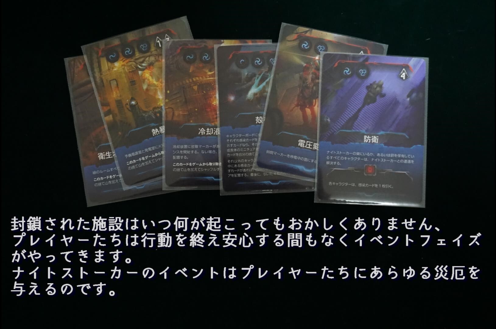 貨物ポッドの発射、時間マーカーの移動、騒音マーカーの除去といった処理を済ませ、イベントカードの解決、ナイトストーカー袋の処理を行う。