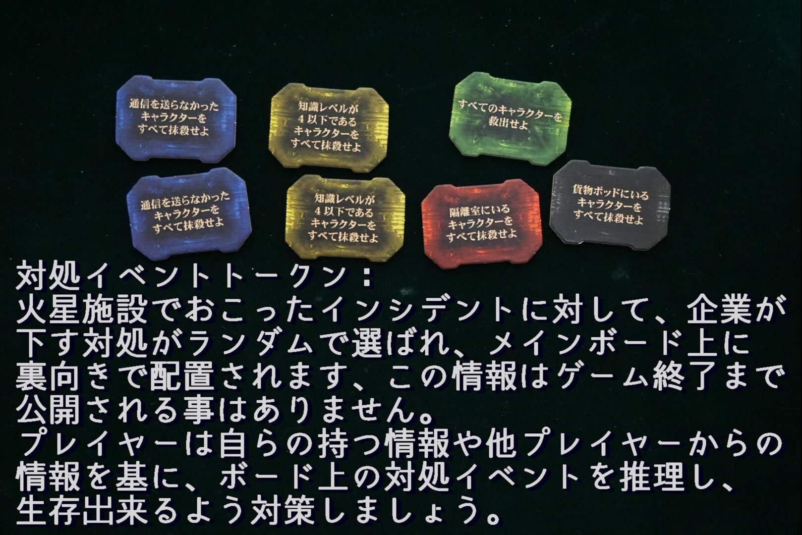 - 各プレイヤーに1枚の対処イベントトークンを配り残ったトークンのうち一枚は発生予定のイベントとして時間経過表の下部に、残りのトークンは警報室に積みます。