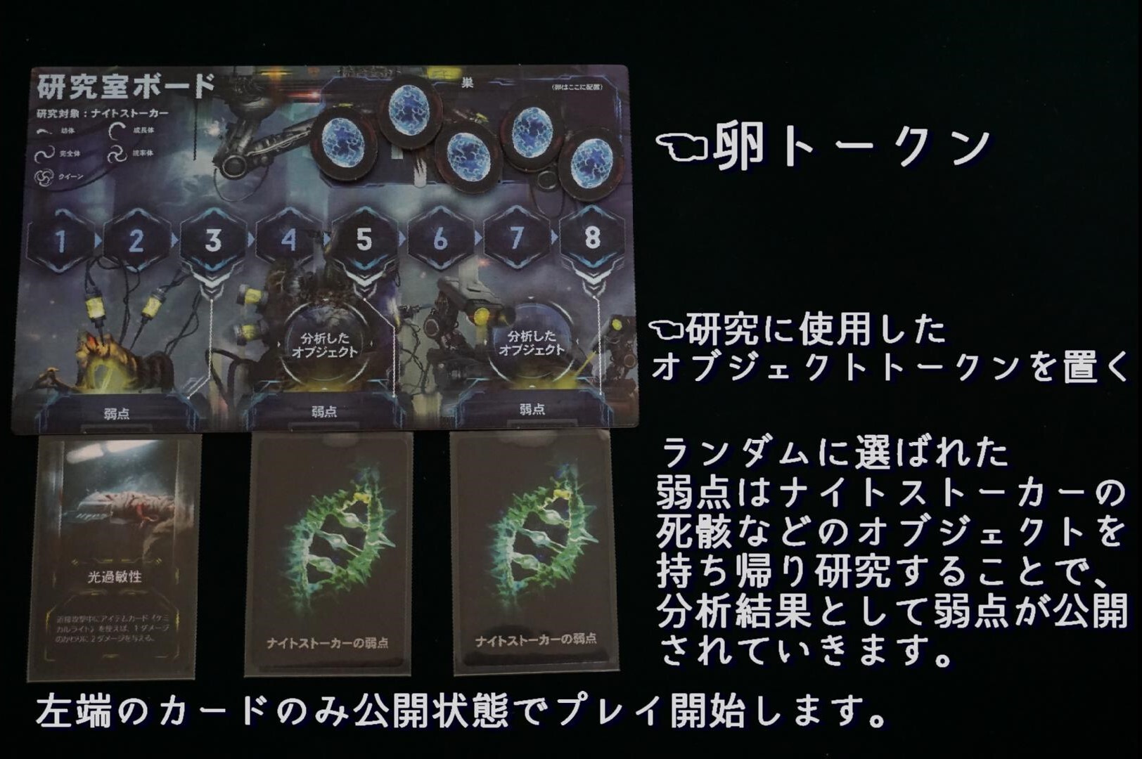 - 研究室ボードをメインボードのそばに置き、卵トークン5個、ナイトストーカーの弱点をランダムに3枚選び裏向きに配置し、左端に置いたカードのみ公開します。