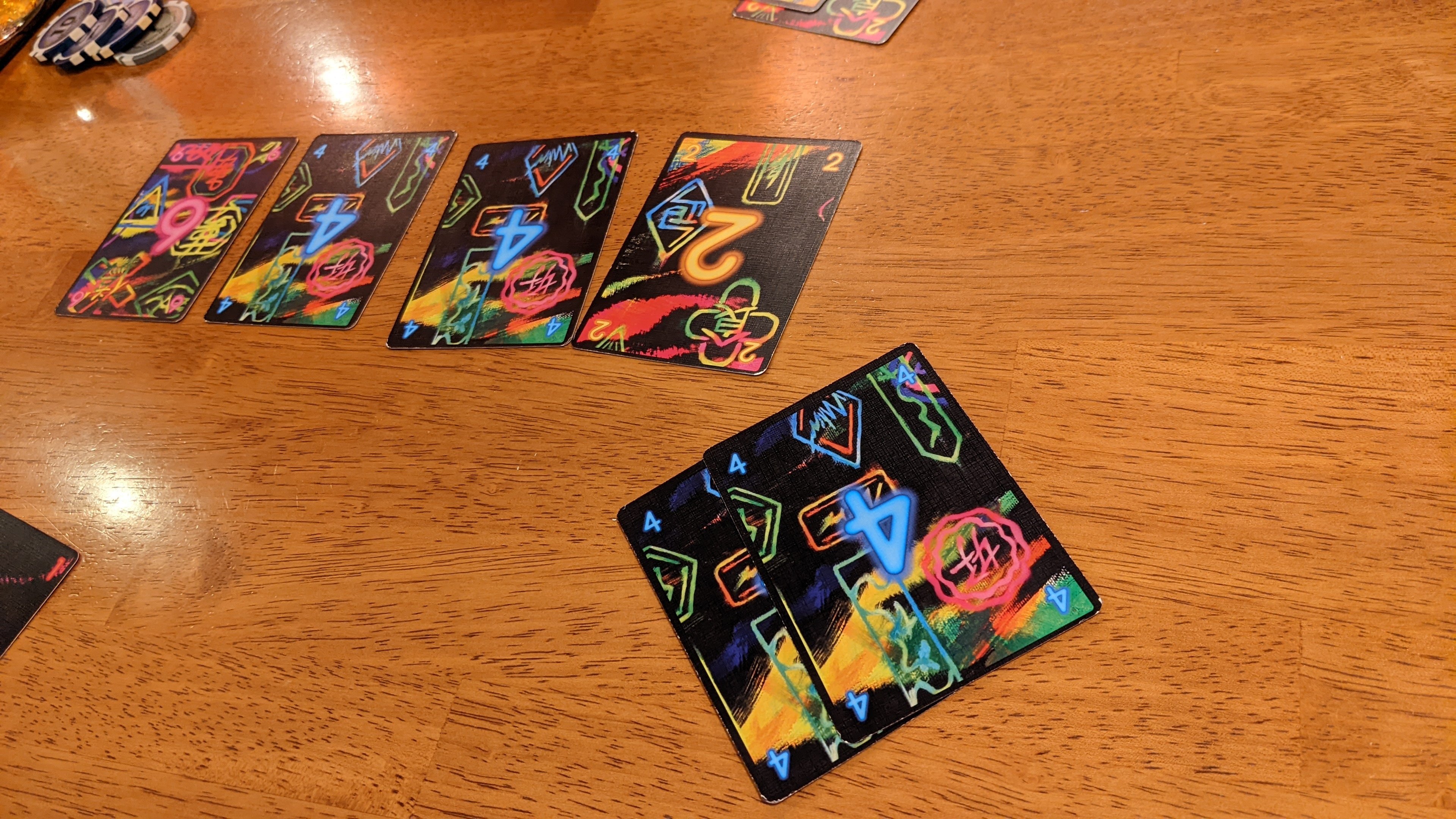 ゲーム前半は全員様子見して、低いカードを1枚出ししていくが、一度高ランクカードが場札に出ると