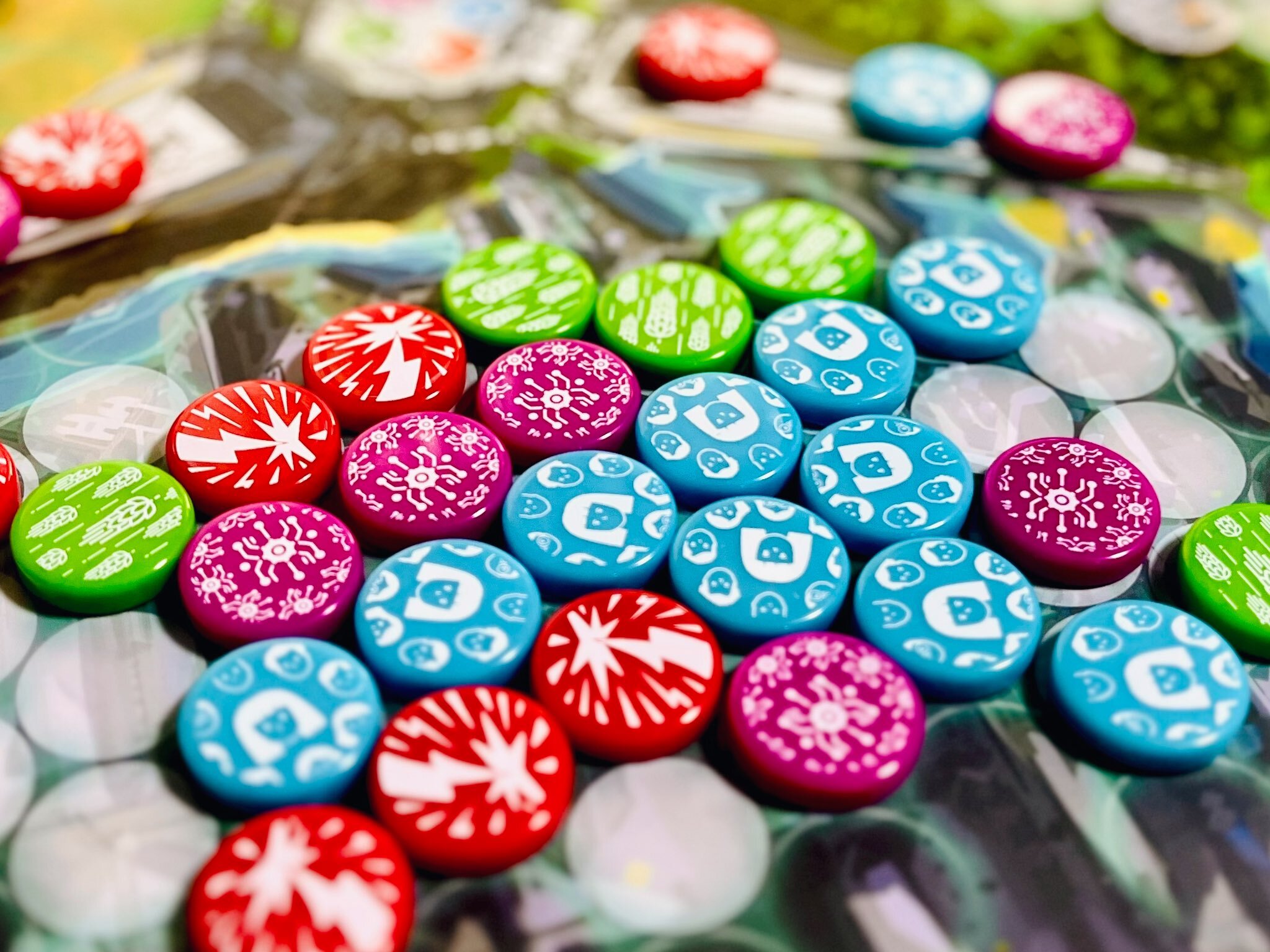 麻雀牌のような手触りのエレメントトークンは、厚み・重みともにしっかりしている上に配色もアイコンも可愛いので、ついつい手に取ってみたくなる良質のコンポーネントだ。- 2興味あり