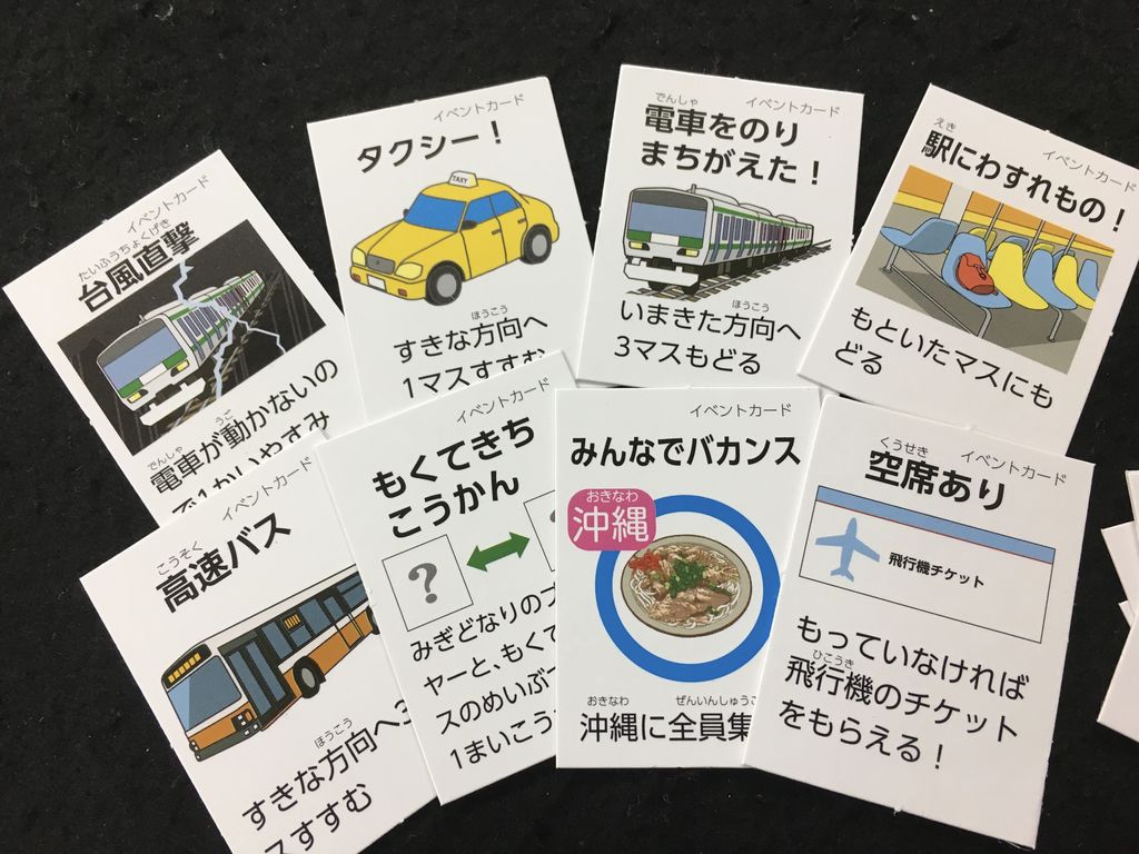 内容は定番の「いくつか戻る」とか「1回休み」とかの他に、「強制的に沖縄に集合させられる」とか、「ミッションのお土産指令を交換させられる」とかがあります。