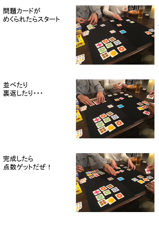 ②タイルを問題カードと同じになるように並替えたり裏返したりする。