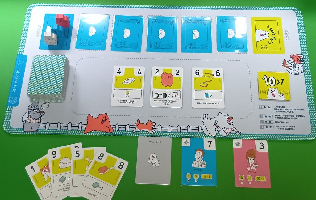 手札は4枚。マーケットには人数分(3人なら3枚)のカードが並びます。スタート位置に自分のコマを置き、気分エリアの5枚のカードをランダムに配置、タイルを黄色(10>1)の面にして配置して準備完了。