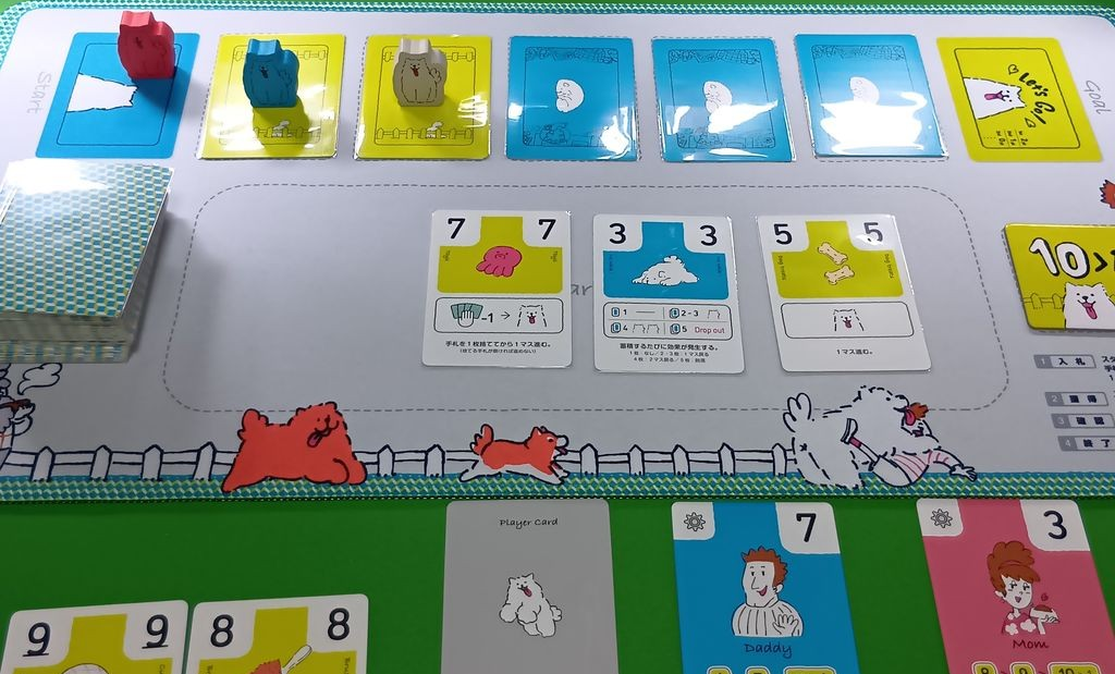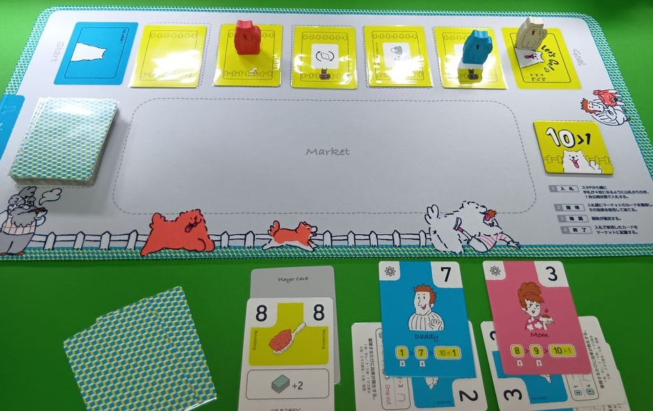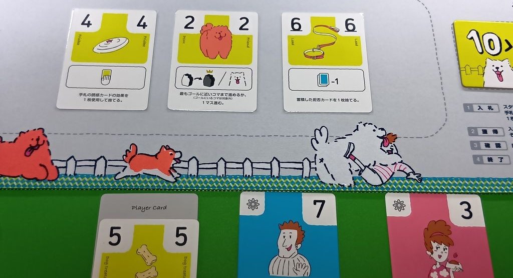 お散歩に行かせるためには「マーケットエリア」にならんだアクションカードを手札から出したカードの数字で入札し、優先順位の高い人から獲得&効果発動。お散歩気分を上げる(マスを進む)ものもあれば、先行した人を戻したりする効果もあり。さらにカード効果により入札の優先順位が「数字の大きい方」「数字の小さい方」それぞれ入れ替わりもあります。