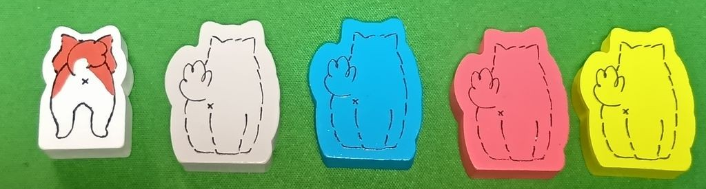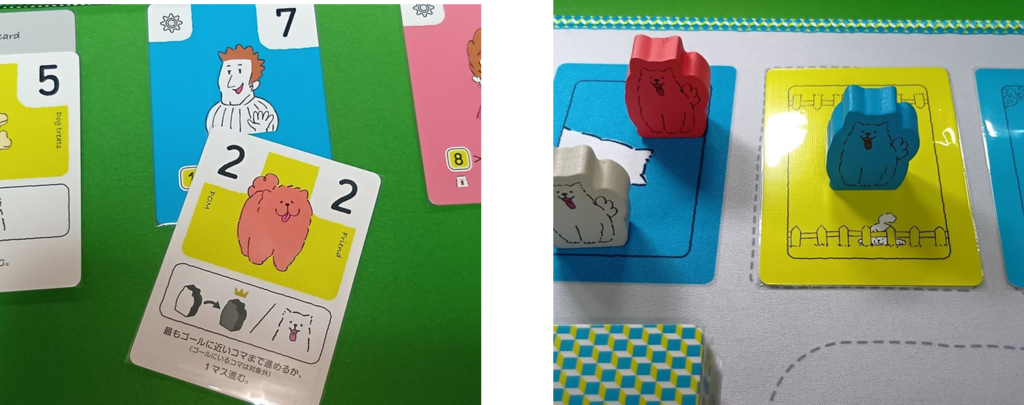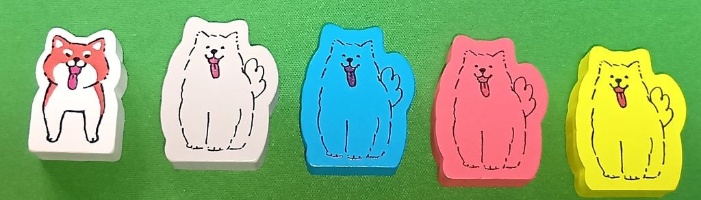 アートワーク:可愛すぎる。木コマはちゃんと正面とお尻側の両面。デイジーも可愛いけど柴犬のちくわが良。わがままを言うとチャウチャウのポムとドーベルマンのリリーもコマにあるとよかったかな。
