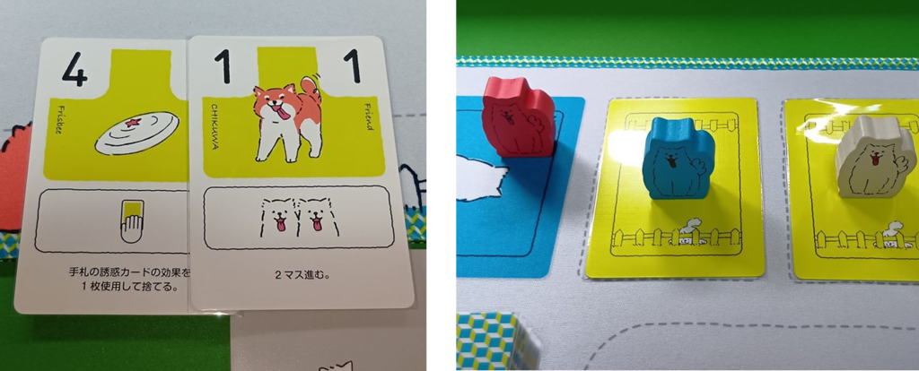 ※マスの移動:カード効果で1マス・2マス進む効果を使った場合、気分エリアの自分のコマを進めます。止まった先で気分カードが青だった場合はめくって効果を適用します(最初の人だけ)。