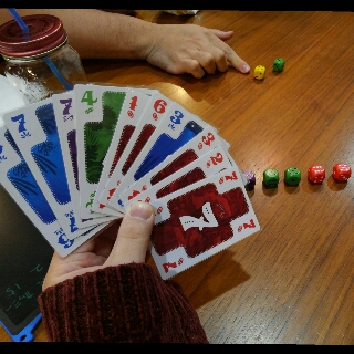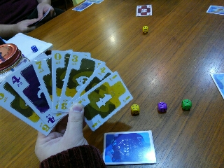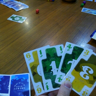 あぁ、言い忘れていたのですがこのゲームはダイスもマストフォローでプレイしなくてはいけませんので、手札にその色のカードがなくてもダイスがあるならプレイしなくてはいけません。