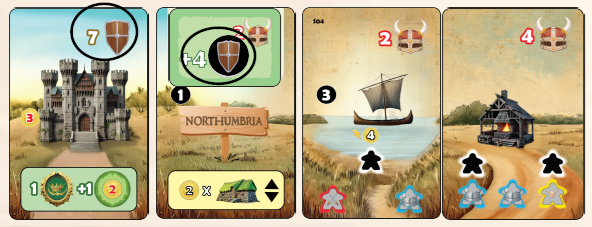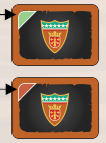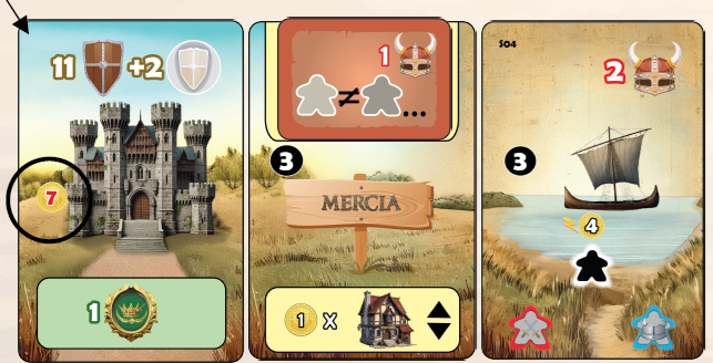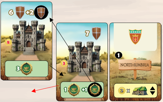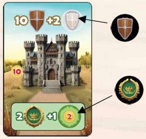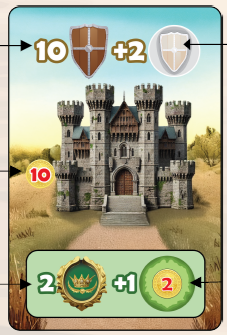 城の見方 - 盾の値 (10) - 盾スペース(盾アップグレードディスクがあれば値が+2されます) - カードのコスト(10コイン) - 名声値(2) - 名声スペース(名声アップグレードディスクがあれば値が+1されます) |