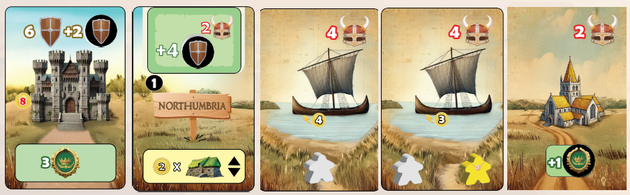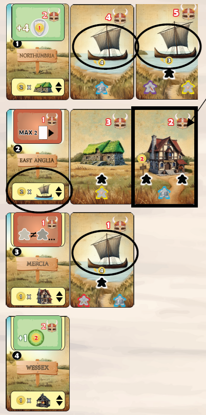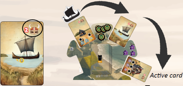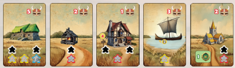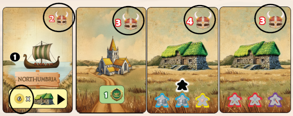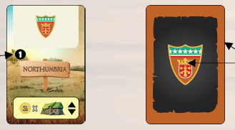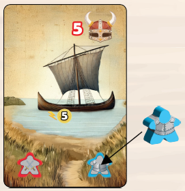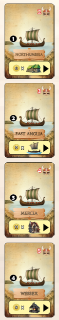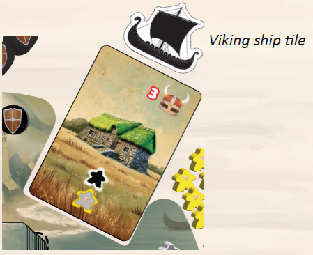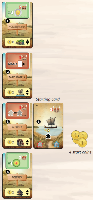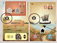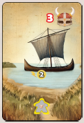 各開始カードの左上隅に追加の数字があります。数字が最も低いプレイヤーがスタートプレイヤーとなり、ヴァイキング船タイルを取ります。 |