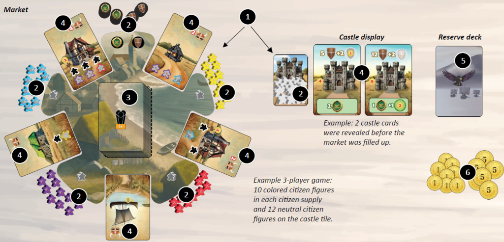 1) ゲームボードをテーブルの中央に置き、その隣に城タイルを置きます。
