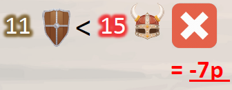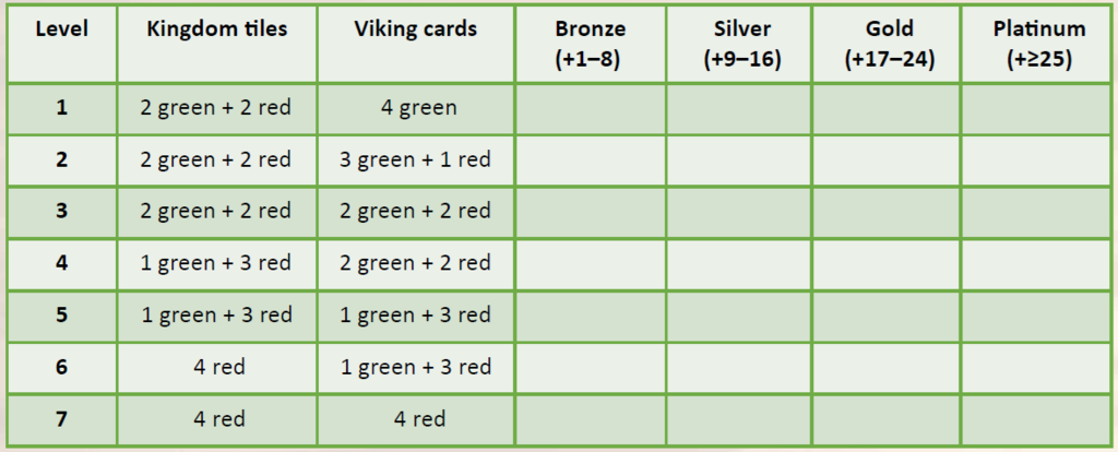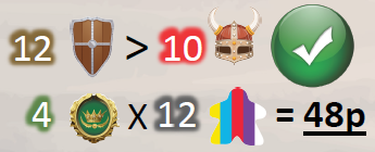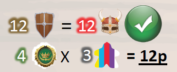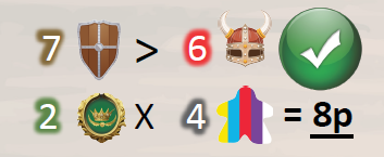 ドローデッキがなくなった後、ゲーム終了がトリガーされます。残りのコインごとに1ポイントを獲得します。その後、盾よりもヴァイキングの兜が多い王国ごとに7ポイントを失います。残りの王国の名声に市民の数を掛けて、それぞれの王国をスコアリングします。最も多くのポイントを獲得したプレイヤーが勝ちます。