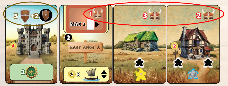 ルーシーはイーストアングリアに宿屋を置いた後、収入を得ます。 この王国カードは、自分の他の王国の船ごとに2コインを与えます。ルーシーは3つの船を持っているので、合計6コインを獲得します。 |