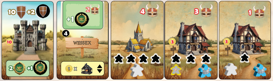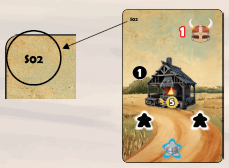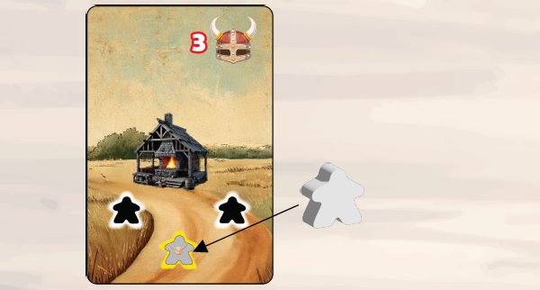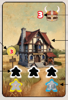 建物の見方 (例:宿屋) - カードのコスト(3コイン、宿屋にのみコストがかかります) - 印刷された市民(3人) - ヴァイキング兜の値(3) - 建物タイプ(宿屋) - 市民スペース(青と黄色の市民コマ用) |