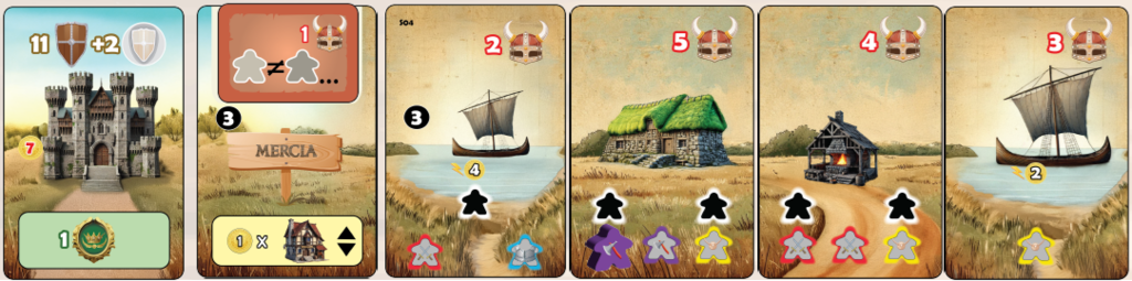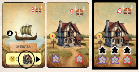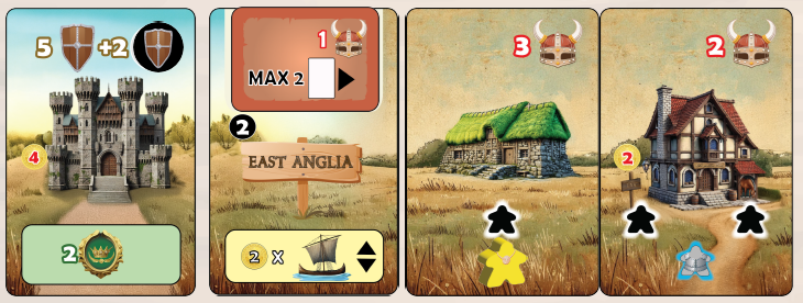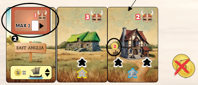 ルーシーはマーケットから宿屋を選びました。宿屋には2コインがかかり、彼女はそれを共通サプライに支払います。 イーストアングリア王国の配置制限は建物カード2枚ですが、現在建物が1つしかないので宿屋も配置することができます。 |