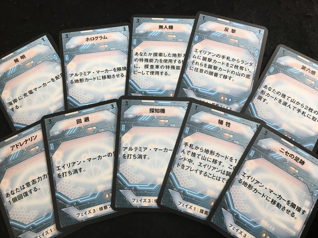中央には『惑星アルテミア』を表す場所カードが10枚、①~⑩まで並べてあって、各人間プレイヤーたちは相談しながら手分けして惑星脱出のための計画を進めていきます。