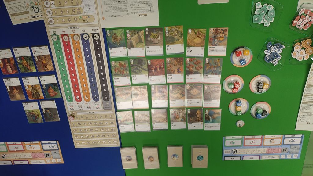 サイコロを使った、セットコレクション+ドラフトゲームですね。その目をコストとして、技術や偉人をセットコレクションするゲームです。ぶっちゃけ、白鷺城に基本的なルールは似ています。
