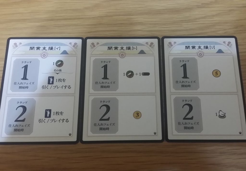 ゲーム開始時に「開業支援カード」を1枚もらい、それにより1~2ラウンド目にお金や資源、助っ人などのボーナスを得られます。テラフォーミングマーズのプレリュードのような序盤加速…ですが効果はあそこまで派手ではなく大体1手半~2手ぶんのアクションぐらいの感じ。