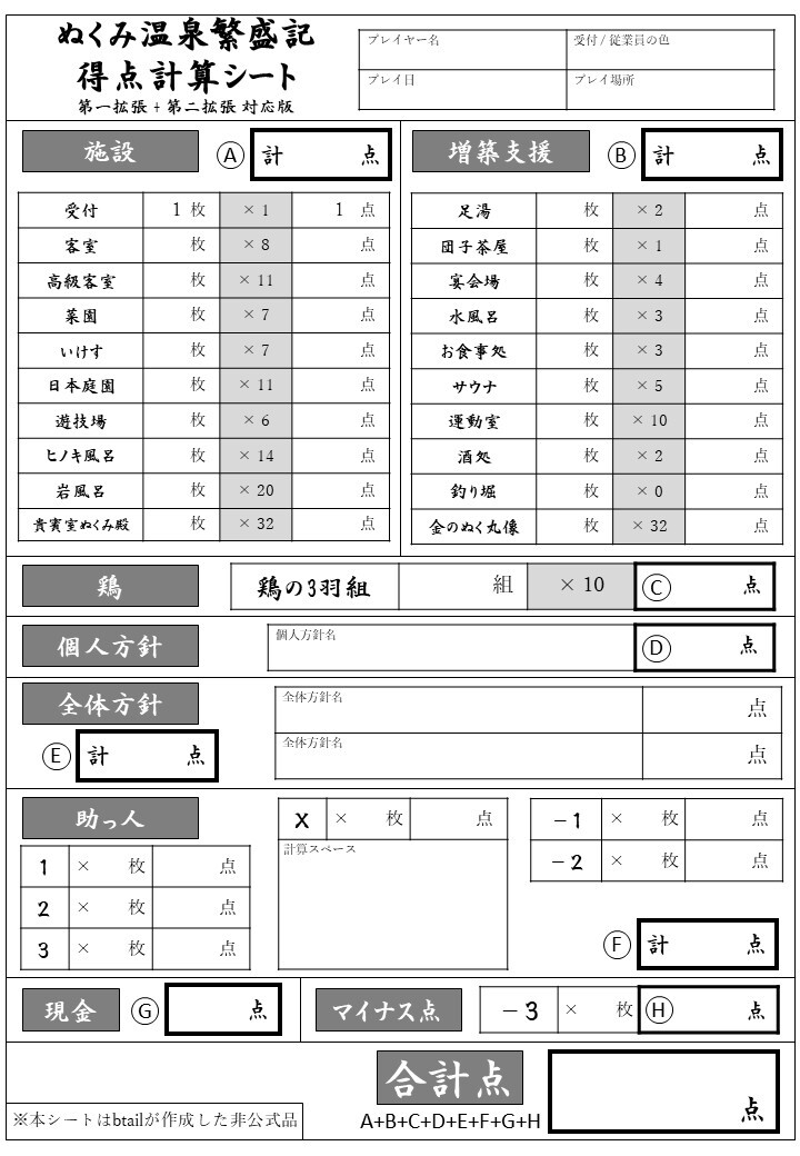 ぬくみ温泉繁盛記の得点計算シートについて、第一拡張 + 第二拡張に対応した版を公開します。A5サイズで印刷すると「ぬくみ温泉繁盛記」本体の箱にも入ります。