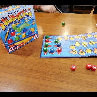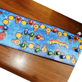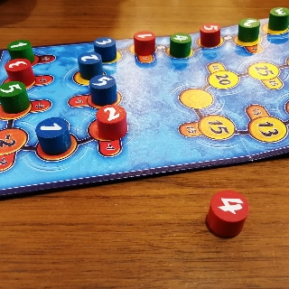 コマを進めていき、自分のコマが連続で3個以上並んだら連続手番になります。ゲーム終了時にコマがいるマスの数字とコマの数字を掛け算した得点が勝利点なので、コマを進め続けられるのは得点アップのチャンスになります。