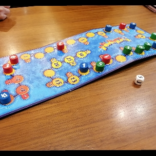 4~5の出目が多いと一気に進むけど、1~2が続くと少しずつ。今回は1の出目が爆走して1がトップでゴール。