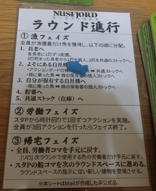 ラウンド進行シートは、魚コマなどをマーカーにして今どの手順をやっているかをチェックするのに使っています。これをやる前はソロプレイ時に船コマの移動あたりを忘れがちでした……。