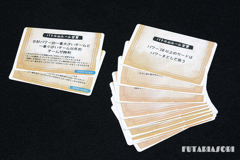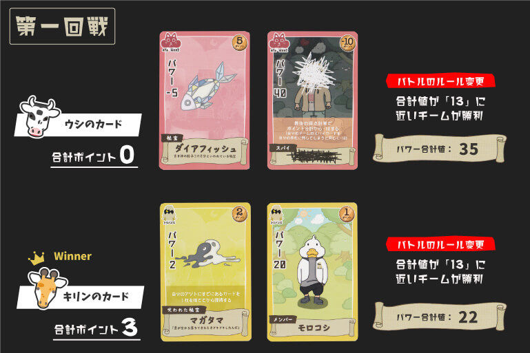 - 2枚のカードがそろったら一斉に公開し、合計値を競う。(※ラウンドによって勝利条件が変わることも。)