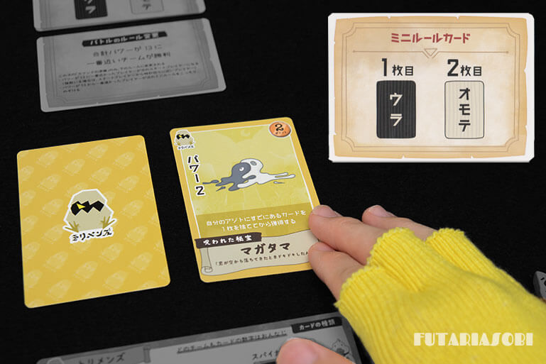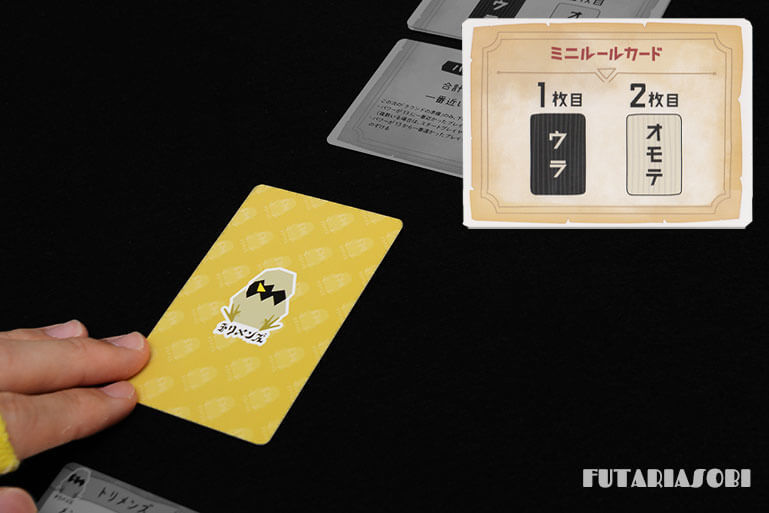 ミニカードをよく混ぜ、裏向きのまま6枚を山札にする。残りは箱に戻す。
