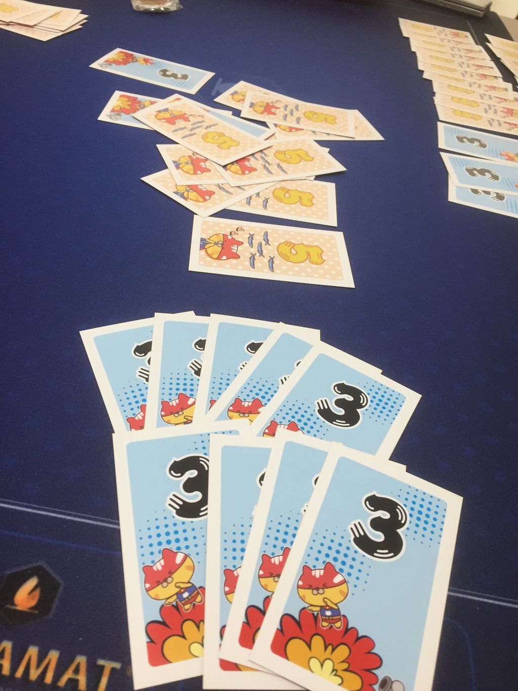 一斉に1~3枚のカードを出し、場に出していきます。ただし、3は3枚、5は5枚になったら引き取らなければなりません。5はプラスですが、3はマイナスです。