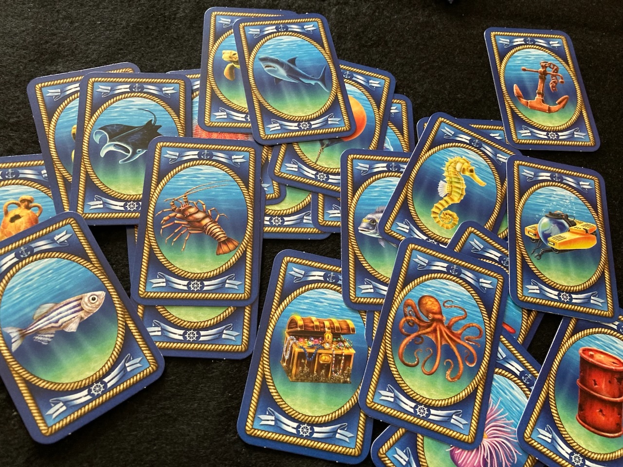 本来のルールでは、各自がお宝カードをシャッフルしてランダムに持ち、ひとつを無事にゲットしたら次のお宝カードをオープンし…と続きます。